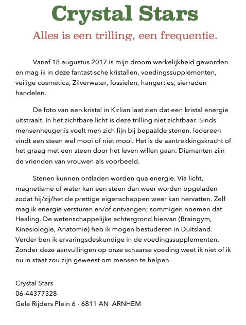 Categorieën Gemstones Waarom stenen kunnen helen… Post author Door Crystal Stars Velp Post date 23 februari 2019 Geen reacties op Waarom stenen kunnen helen… Delen: Klik om te delen op X (Opent in een nieuw venster) X Klik om te delen op Facebook (Opent in een nieuw venster) Facebook Vind-ik-leuk Aan het laden... Gerelateerd Door Crystal Stars Velp trading Gemstones, Fossils, Minerals, Metals, YoniEggs & Jewelry from all over the world. Kinesiology, Healing @ a distance, Braingym & FamilyConstellation. View Archive → ← Vind Uw Rust → Van een bezorgde Nederlandse Mede-Europeaan Plaats een reactie Reactie annuleren Deze site gebruikt Akismet om spam te bestrijden. Ontdek hoe de data van je reactie verwerkt wordt.