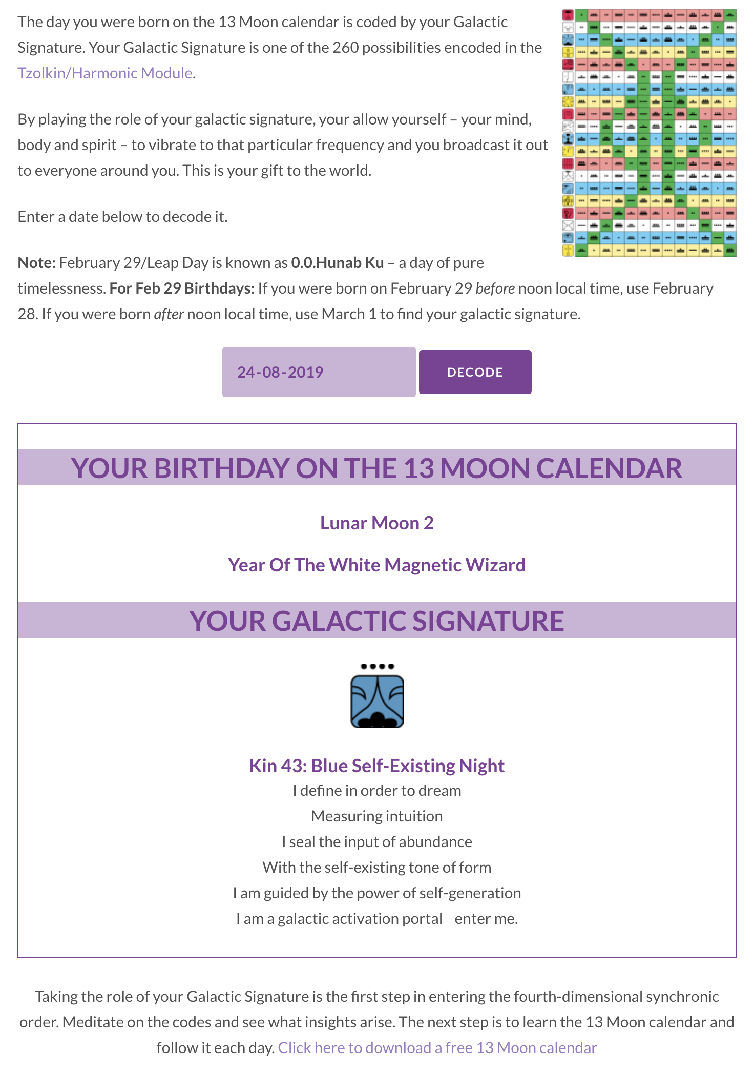 Het is de exacte aanwending van deze 13-Manen-28-dagen-kalender [Maya-Kalender] die IEDER mens tot een Noösferische chip van het Regenboog Brein of Zero Point Field zal maken. Wordt de Noösfeer geopend, dan zal de Dagelijkse Frequentie van Tijd (f = 1 / T) ook blijven aangestuurd worden door middel van de aanpassing met de Frequentie van het Noösferische Controlepaneel; de PSI-bank. Hierdoor zal het bewustzijn van de mensheid uiteindelijk veranderen en het onderontwikkelde niveau waardoor het momenteel in de Kunstmatige Wereld van de Technosfeer wordt gehouden zal uiteindelijk worden overstegen.