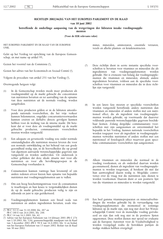 De afgelopen dertien jaar heeft Europa geworsteld met een universele veiligheidsstandaard voor supplementen van vitaminen en mineralen. Omdat de lidstaten van de Europese Unie elkaar onderling in de weg zaten, heeft men geen overeenstemming kunnen bereiken. In 1992 heeft Brussel een poging ondernomen tot het vaststellen van een richtlijn waarbij maximaal drie keer de Aanbevolen Dagelijkse Hoeveelheid (ADH) van een supplement mag worden gebruikt. Ook dit voorstel werd niet door alle lidstaten geaccepteerd.