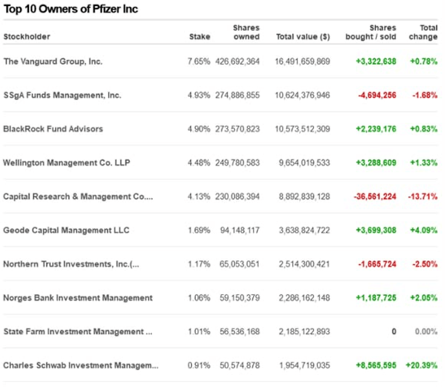 Laut Simply Wall Street waren BlackRock und Vanguard im Februar 2020 mit 7 % bzw. 3,5 % der Aktien die beiden größten Anteilseigner von GlaxoSmithKline. Bei Pfizer werden die Eigentumsverhältnisse vertauscht, wobei Vanguard der Top-Investor und BlackRock der zweitgrößte Aktionär ist.